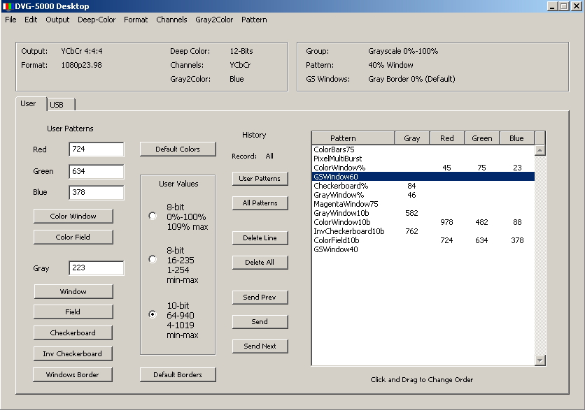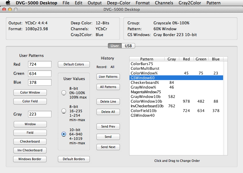 1. Select color and Gray Scale window sizes from 5.0% to 20.0% of frame area. 2. Select checkerboard sizes from 2x2 to 9x9. 3. Turn PLUGE stripes in Gray Scale window patterns on or off. 4. User values entered in % are now converted to both 8-bit and 10-bit precision digital video values. 5. The HDMI Standard Range may be disabled to enter 10-bit(8-bit) digital video values greater than 1019(254) or less than 4(1). New in version 2.6 (requires DVG-5000 version 4.5x firmware) 1. Gray Scale Windows borders (window surround) can be set to 8-bit, 10-bit, or integer % user values. 2. Gray2Color Function - Any gray (non-color) pattern can be set to green, blue, red, cyan, yellow, or magenta color. New in version 2.5 1. Pattern history lists can be saved & opened as files. 2. Previous history list is automatically restored when re-opening the DVG-5000 Desktop. 3. Direct entry of 8-bit custom color and grayscale values in addition to direct entry of 10-bit custom values. 4. Delete All button added for History list. |