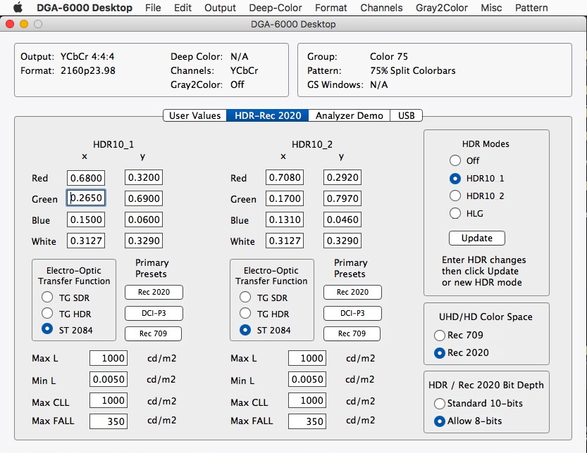 | Free PC and Mac programs to operate the AccuPel DGA-6000 from your computer desktop. The Desktop app also allows you to enter color and grayscale values, set up HDR metadata, and demonstrates automated measurements using the basic Analyzer functions. | AccuPel DGA-6000 Desktop v1.11 (Initial Release